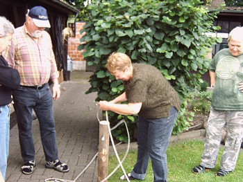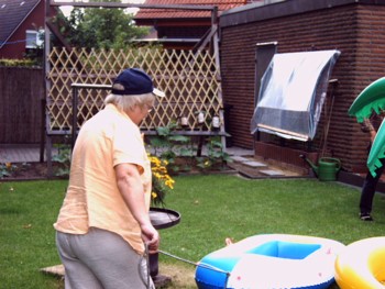 Keiner hörte uns. Rita begann den Maschendrahtzaun zu lösen, Jutta und Marlis nahmen Kontakt mit einer Anwohnerin auf und überzeugten diese, uns eine Leiter zu holen.