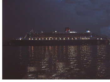 Da wir bis auf ein Polizeiboot die Einzigen hier auf dem Wasser sind, passieren wir die QM 2 gleich drei mal.